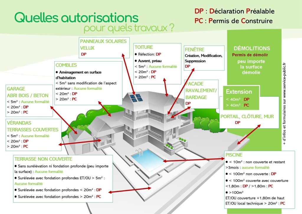 La délivrance d’une autorisation d’urbanisme permet à la commune de vérifier que les travaux sont conformes aux règles d’urbanisme. En fonction du type de projet et du lieu, il faut déposer une demande de permis (permis de construire, d’aménager…) ou une déclaration préalable de travaux. Avant de commencer les travaux, il est recommandé de demander un certificat d’urbanisme pour obtenir des informations sur le terrain faisant l’objet de travaux.